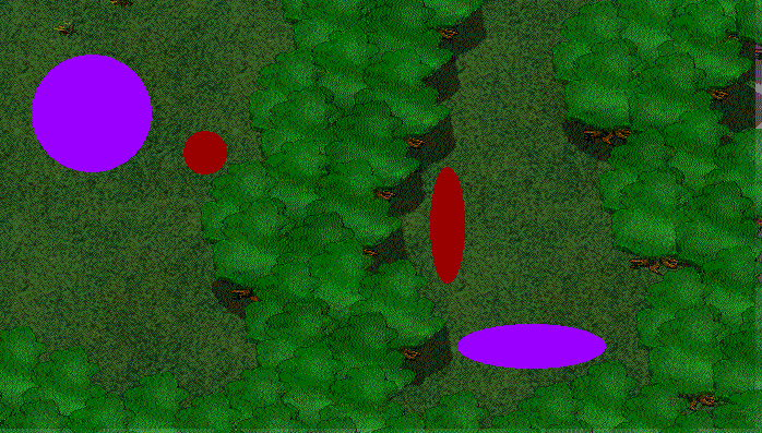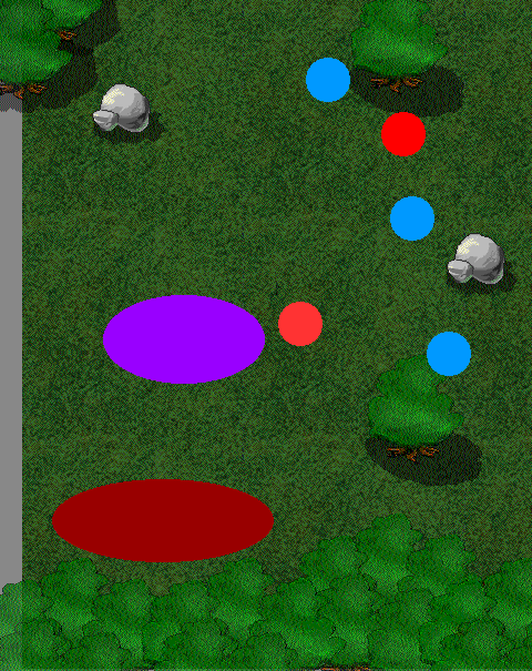 The purple circle represents 3 fighters for clearing and holding non magic monsters the fighters must maintain space north of them for the hot healer to get to the exit north of them.